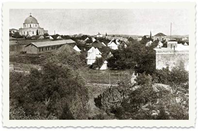 * הסבר מלא לתצלום צד ג': בית הכנסת במחנה יהודה, סוף המאה ה-19, השלט על הבית: הכנסת אורחים הגדול תפארת ציון וירושלם, נוסד ע"י שמואל לעווי בעזרת נדיבי אמריקה
