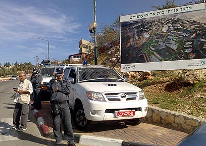 כוחות משטרה בכניסה לבית אריה, הבוקר (צילום: אבי צור)