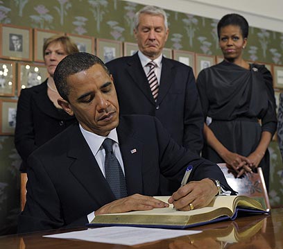 אובמה חותם על ספר מבקרים בעיריית אוסלו (צילום: AP)