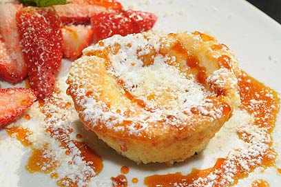 - יוצקים את הסירופ החם על הפודינג. מפזרים שקדים פרוסים וקלויים, ומעט פירות יער או תותים.