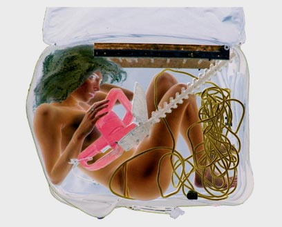 מימין העבודה החדשה שיצרה גבעתי לתערוכה שעולה מחר בישראל. גבעתי: "הבחורה נעולה במזוודה ומחזיקה כספת כדי להמחיש עד כמה התכולה של המזוודה אכן בטוחה".