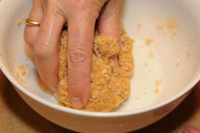 - יוצקים את תערובת הביצים לקערת פירורי הלחם ומערבבים ביד עד שמתקבל בצק רך (אם העיסה יבשה מוסיפים כף או שתיים מרק. הבצק אמור להיות רך ולא מאוד דביק).