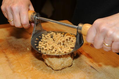 - מניחים את הבצק על משטח עבודה, מועכים בעזרת מועך תפוחי אדמה עם חורים לא גדולים מדי ומכניסים ישירות למרק. מבשלים עד שהפתיתים צפים על פני המרק. מגישים חם.