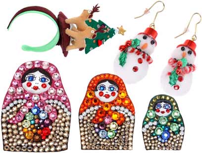 עברת את גיל 16? זה לא בשבילך: עגילים בצורת אנשי שלג, רשת ACCESSORIZE במחיר 26 שקל; סיכות בבושקה, דורית שדה, 550-220 שקל; קשת עם סמלי חג המולד, קאלה, 350 שקל (צילום: ניר יפה)