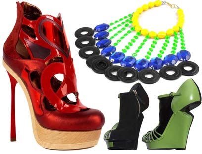 קצת נוחות לא תהרוג אתכן, אבל העקבים האלה בהחלט עלולים להיות קטלניים: שרשרת, ליאת גינזבורג, 1,140 שקל; נעליים שחורות וירוקות, Moschino Chip and Chic לאניגמה, 3,500 לזוג; נעל אדומה, ג'ון גליאנו לאניגמה, 4,900 שקל (צילומים: בוטיק אניגמה, גל אלי)