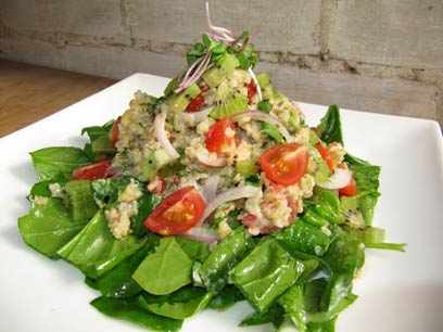 - מסדרים על צלחת ערמה יפה של עלים ומעל את הקינואה והירקות. מגישים מיד.