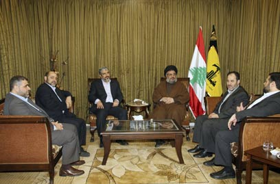 אחים לנשק. מזכ"ל חיזבאללה, חסן נסראללה, נועד היום (שבת) עם משלחת של בכירי חמאס ובראשם ראש הלשכה המדינית של התנועה, חאלד משעל, המבקר בביירות. רשת "אל-מנאר" של חיזבאללה דיווחה כי בפגישה נדונה "חוסר היכולת הערבית מול הסכנות הישראליות".