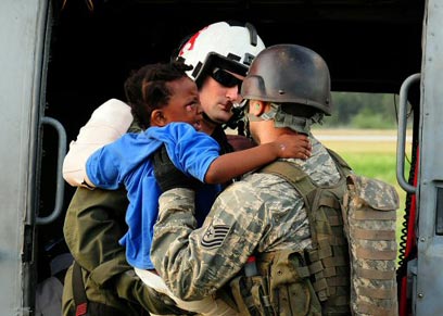 חיילים אמריקנים מחלצים ילד. אלפים נוספים בדרך (צילום: AFP)