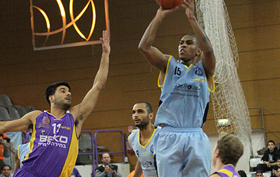 ג'ון שארפר בדרך לעוד סל. 4 שלשות לאמריקני של ר"ג (צילום: עוז מועלם)
