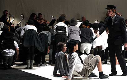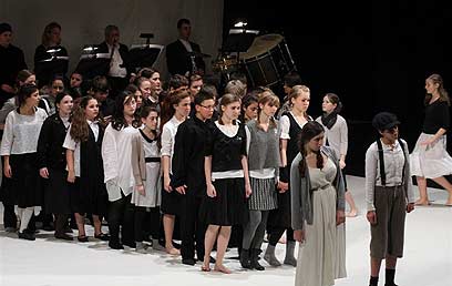 זה התחיל במבוא הנשמע כלקוח משיר ילדים (חצוצרה וכינורות), והמשיך בקינה קורעת לב לכינור ופסנתר (מרקוס צוגהר). הם ניגנו ברוך ועדינות רבה, כמעט בחולשה. לאחר מכן עלה לבמה הילד פאפיצק (סימון קרושוויץ ומיכל אברהמי) ואחותו אניקה (קים אנגלהארט ושירה קראביץ), מלווים על ידי כינור ופסנתר באווירת קאברט של ה-Fin de siècle (סוף המאה) ומקהלת הילדים התאספה סביבם.