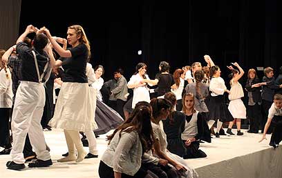 התזמורת ניגנה בחלקה האחורי של הבמה, בעוד הילדים שרו וחיקו בו זמנית את משחקיהם של ילדי הגטו. היה נדמה כאילו המוזיקה באה ממקום רחוק שאיננו עוד קיים והוויית הגטו עטפה את אולם הקונצרטים. זו היתה התחושה כשנוגנו, בין היתר, מחולות סלאביים של דבוז'אק ושירו של המלחין גדעון קליין, אשר נרצח גם הוא באושוויץ. מקהלה אחת שרה קווים מליסמטים ארוכים, בעוד מקהלה שנייה שרה בצורה סילבית את הטקסט של השיר "בחורי לאן תיסע".