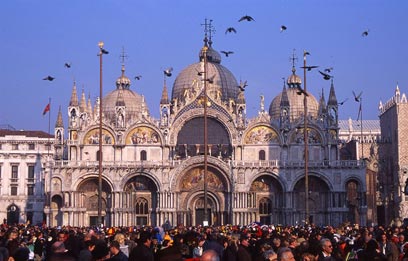 16. כיכר סן מרקו - המון רב צובע את הכיכר. נפוליאון כינה את הכיכר 'הטרקלין היפה ביותר של אירופה'. ברקע קתדרלת סן מרקו המפוארת