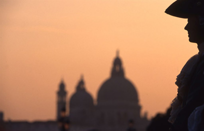 15. צללית של אציל - תחפושת של אציל על רקע שקיעה שנותנת את האור והצבעים החמים. האלמנטים החדים של הפרופיל (קצה האף והכובע) מתחברים לכיפות כנסיית Santa Maria Della Salute המחודדות