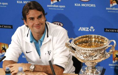 פדרר עם הגביע האחרון באוסף, באוסטרליה. לא עוצר (צילום: AP)