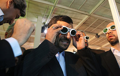 אחמדינג'אד "מדגמן" משקפי הגנה מלייזר בתערוכה בטהרן (צילום: AFP)