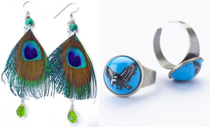 טבעת עם תמונה של בירה נשר למותג "KOTIK", מחיר 55 שקל; עגילי נוצה למותג ZOZI, מחיר 99 שקל (במקום 150). צילומים: יסמין ואריה צלמים, זהבית אברהם