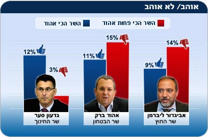 מי שהשאיר את משתתפי הסקר פחות אדישים הוא שר הביטחון ברק. חרף תחושת הביטחון שהוא משרה על הציבור הישראלי, הוא עדיין נאבק על הנקודות החיוביות: 11 אחוז מהציבור חושבים שהוא השר הטוב ביותר בממשלה, אך מצד שני, 15 אחוז סבורים שהוא השר הכי פחות מוצלח. גם שר החוץ אביגדור ליברמן, למרות התבטאויותיו המדיניות מעוררות הסערות, קיבל את תמיכתם של תשעה אחוז מהישראלים - אך 14 אחוז חשבו שהוא השר הכי פחות מוצלח. שר האוצר, יובל שטייניץ, נאבק גם הוא על מעמדו ועל מקומו: שני אחוז חושבים שהוא המוצלח ביותר, אולם שמונה אחוז חושבים שהוא הגרוע ביותר.