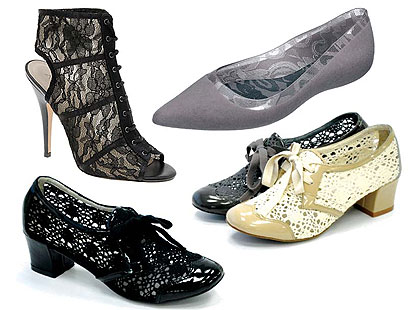 מימין למעלה, עם כיוון השעון: נעלי בובה של מליסה לרשת סטורי, 379 שקל; נעלי תחרה עם שרוכים בשלושה צבעים, ALL BLACK לבוטיק שושו, 620 שקל; מגף סטילטו של אלדו, 449 שקל (צילומים: טל טרי, אסף רייז)