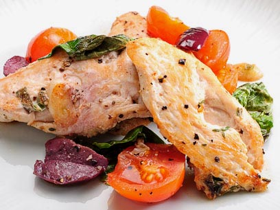 חזה עוף מוקפץ עם עגבניות שרי, שום וזיתי קלמטה