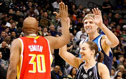 נוביצקי ושלישיית דאלאס חוגגים ניצחון קבוצתי (צילום: AFP)