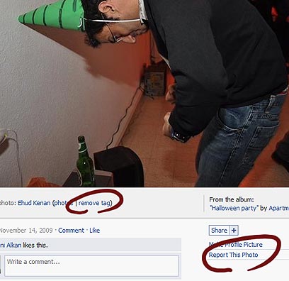 רוצים להסיר את התמונה לגמרי? הקליקו על Report this Photo ותתבקשו לנמק מדוע אתם רוצים להסיר את התמונה - אם היא פורנוגרפית, פרסומית וכדומה. אך פייסבוק אומרת כי לא תסיר תמונות שסתם "אינן מחמיאות" ומשאירה את זה לטיפול בין הגולשים לבין עצמם.