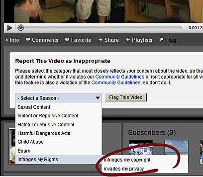 חפשו את הקישור Flag ושם תוכלו לבחור סיבה לסימון הסרט - אם מדובר למשל בתוכן מיני, אלים פוגעני - או באפשרות האחרונה - פוגע בפרטיות או בזכויות היוצרים שלכם.