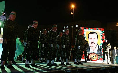 עצרת חמאס בצפון הרצועה, ברקע תמונת אל-מבחוח (צילום: AFP)