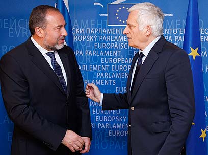 ליברמן ויו"ר הפרלמנט האירופי, יז'י בוז'ק, הערב בבריסל (צילום: AFP)