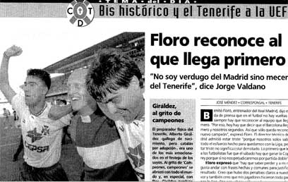 למרבה האירוניה, מי ששימש אז כמאמנה של טנריפה והוליך אותה להצלחות גדולות הוא לא אחר מאשר חורחה ולדאנו, כוכב העבר של ריאל ומנהלה הספורטיבי כיום. "טנריפה מהווה זיכרון מיוחד מאוד עבורי", הודה ולדאנו השבוע, "אבל ברור שהפעם אני רוצה שריאל תנצח".