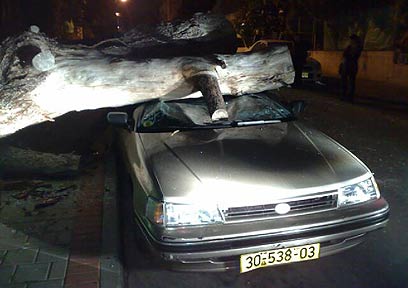 תושבת העיר ושני ילדיה עמדו להיכנס למכוניתם שחנתה ברחוב לילינבלום. הם נדהמו לראות עץ קורס מאחת הגינות הסמוכות אל תוך רכבם ומרסק אותו. "לא רוצה לתאר מה היה קורה אם היינו באים שניות מאוחר יותר", סיפרה הנהגת ההמומה