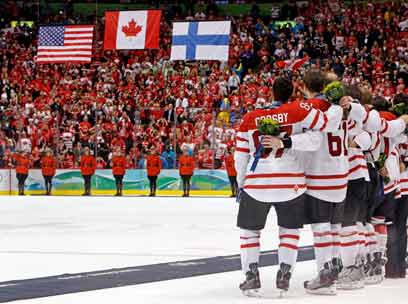 נבחרת ההוקי הקנדית שרה את ההמנון אחרי ניצחונה בוונקובר (צילום: AP)