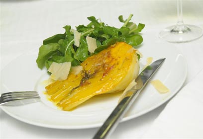 - הגשה: בעזרת קולפן ירקות פורסים מהפרמזן סרטים דקים ורחבים.