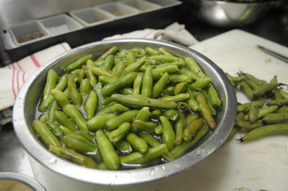 - מוסיפים את תרמילי הפול וחולטים אותם כדקה. מוציאים מהסיר ומסננים.