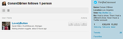 מגיש הטלוויזיה קונאן אובריאן החליט לעשות מעשה ולפרסם את עצמו ועוד מישהו אקראי בתקופה הנוכחית בה אינו מופיע בטלוויזיה. הוא הודיע שבכוונתו לשנות את חייו של משתמש אקראי ברשת המיקרו-בלוגינג טוויטר על ידי כך שמשתמש זה יהיה היחיד אחריו יעקוב.