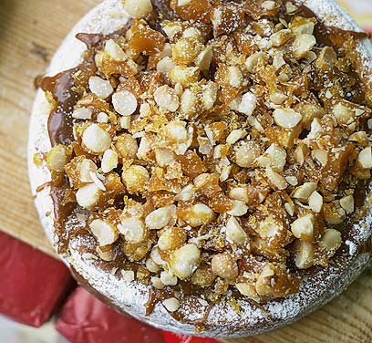 - להכנת ציפוי האגוזים, מפזרים את האגוזים על תבנית אפייה וקולים אותם בתנור ב-140 מעלות במשך כ-15 דקות, עד שהם זהובים. מוציאים מהתנור ומניחים בצד. מרפדים תבנית אפייה בנייר אפייה. שמים את הסוכר בסיר בעל תחתית עבה מאוד (חשוב ששכבת הסוכר בסיר לא תהיה גבוהה יותר מ-3 מ"מ, ולכן בחרו סיר גדול). מחממים את הסוכר בעדינות עד שהוא הופך לקרמל חום־זהוב. אסור לבחוש אותו בשום שלב. לא נורא אם כמה חלקי סוכר קטנים לא נמסו לגמרי. מוסיפים בזהירות את האגוזים הקלויים ומערבבים בעדינות בכף עץ. כשרוב האגוזים מצופים בקרמל, יוצקים אותם על התבנית המרופדת ומשאירים להתקרש. שוברים חתיכות וקוצצים אותן גס מאוד בסכין גדולה. נחמד להשאיר חלק מן האגוזים חצויים בלבד או אפילו שלמים.