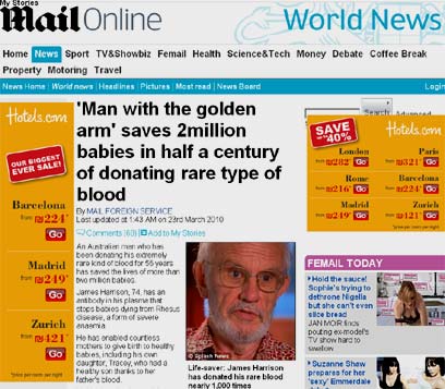 ג'יימס הריסון שבר שיא מיוחד במינו: האוסטרלי בן ה-74 תרם את סוג דמו הנדיר כל חייו, ובכך הציל מעל שני מיליון תינוקות. הריסון נושא בדמו נוגדן המונע מוות בתינוקות מסוג של אנמיה חמורה; דמו כה ייחודי, עד שביטח אותו בסכום של מיליון דולר אוסטרלי.