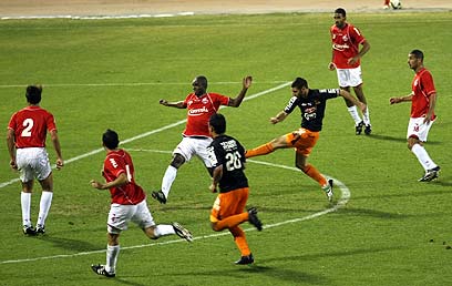 אלירן עטר בועט לשער. משחק חלש של שתי הקבוצות (צילום: רועי עידן)