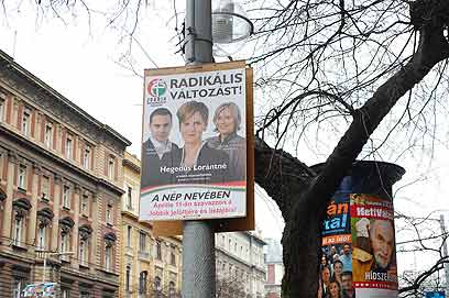 כרזה של מפלגת הימין הקיצוני "יוביק" ליד בניין הפרלמנט בבודפשט