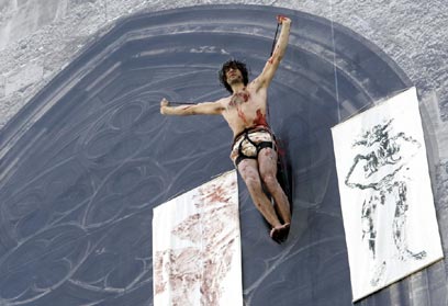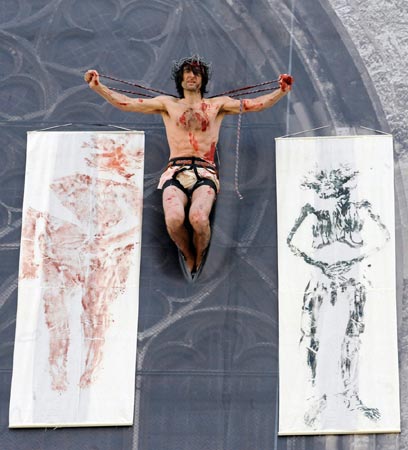 כולנו מכירים את הוויה דלורוזה שעבר ישו בירושלים לפני אלפיים שנה בדרכו לצליבה. ובכן, דרכו של אמריך וייסנברגר היתה קצרה יותר, אך מסוכנת לא פחות. אמן הפרפורמנס האוסטרי עורר מהומה בסוף השבוע האחרון כשטיפס על קתדרלת סנט שטפן בוינה (שטפנסדום) ותלה עצמו כשהוא מחופש למחולל הנצרות הצלוב בגובה עשרים מטרים.