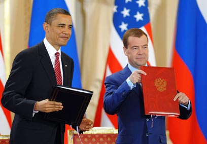 אובמה ומדבדב אחרי החתימה (צילום: AFP)