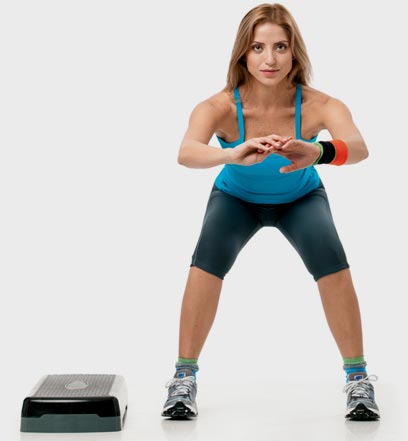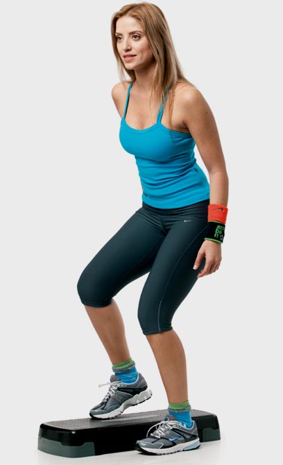 1. עמדי על המדרגה בעמידת פישוק נוחה, הברכיים כפופות מעט, הבטן אסופה והישבן מכווץ.