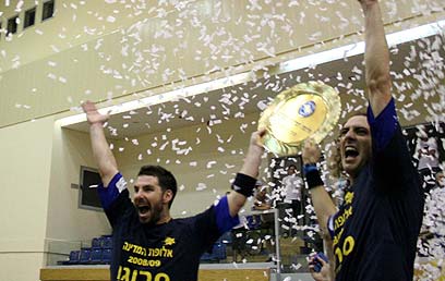 נאמן וג'ו מתתיה עם צלחת האליפות בעונה שעברה (צילום: יועד כהן)