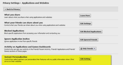 לחיצה על Clicking here תציג את המסך הבא הנגיש גם באמצעות בחירה באפשרות Privacy Settings ומתוך Applications and Websites לחצו על Edit Settings מתחת ל-Instant Personalization.