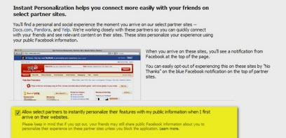 אפשר לראות את התכונה בפעולה בינתיים באתרים כמו Pandora.com, Yelp.com וגם Docs.com המשותף למיקרוסופט ולפייסבוק ובקרוב היא תופיע באתרים נוספים רבים (אין קשר אגב, לכפתור ה-Like שעומד להיות מוטמע גם הוא באתרים חיצוניים). תכונה זו הופכת את האתרים החביבים עליכם (מאלה המשתפים פעולה עם פייסבוק בעניין) לחברתיים, ומציעה לכם תכנים המותאמים אליכם באופן אישי.