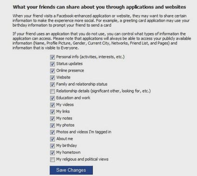 לא פעם חברים שמשתפים באתרים חיצוניים ובאפליקציות מידע אישי שאתם פירסמתם בפרופיל שלכם עלולים לגרום אי נחת. אפשר לשלוט בהגדרות השיתוף של חברים דרך דף Applications and Websites ובחירה ב-Edit Settings ליד What your friends can share about you. אפשר לקבוע, למשל, שאיש לא יוכל לשתף עדכוני סטטוס שלכם באתרים חיצוניים או כל מידע אחר שלא תרצו בשיתופו.