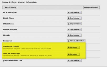 סובלים מבקשות חברות סיטונאיות מאנשים שאתם לא מכירים? בעמוד Contact Information באזור Privacy Settings אפשר לקבוע שרק חברים של חברים יוכלו לבקש להוסיף אתכם כחברים חדשים ולשלוח לכם הודעות. אגב, כדאי לוודא שהגדרות הפרטיות לא יותר מדי נוקשות גם ביחס לציפיות שלכם, מצד שני.