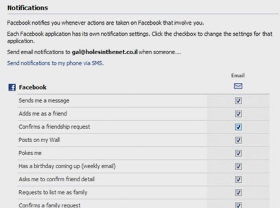 אפליקציות חיצוניות בפייסבוק אינן יכולות עוד לשלוח לנו התראות במייל אלא אם כן ביקשו וקיבלו במפורש את רשותנו לכך, ויש בכך ברוך שפטרנו גדול. עם זאת, פייסבוק ישלח לכם התראות במייל על מגוון רחב של פעולות באתר: הודעה חדשה שהתקבלה, בקשת חברות חדשה, Poke חדש, תיוג שלכם בתמונה, תגובה לתגובה שלכם על פוסט, תגובה לפוסט שגם אתם הגבתם לו ועוד. כדי להסיר חלק מההתראות האלה בקרו באזור Account Settings ובחרו בלשונית Notifications.
