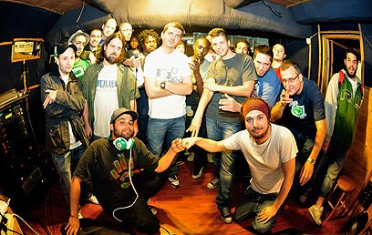 צ'ולו (שני מימין), עם אורטגה, מש, סגול 59, נימי ומשתתפי הערב (צילום: נעה גרייבסקי)