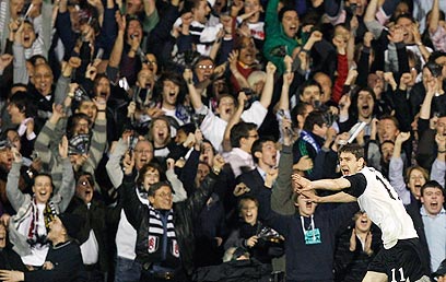 זולטן גרה חוגג עם אוהדי פולהאם עלייה הסטורית לגמר (רויטרס)