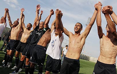 שחקני קרית שמונה חוגגים את החזרה לליגת העל (אלי אלגרט)